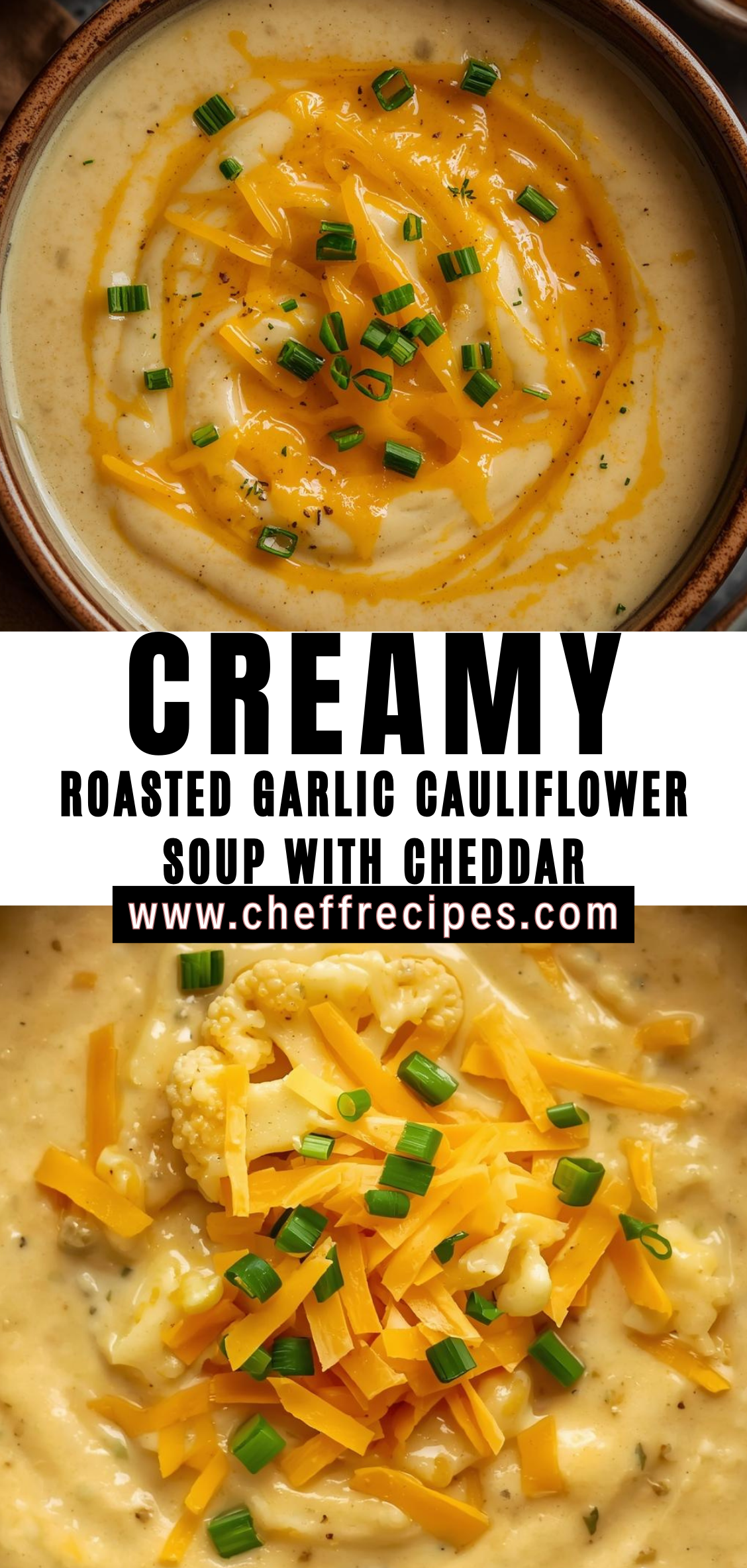 Creamy Roasted Garlic Cauliflower Soup with Cheddar