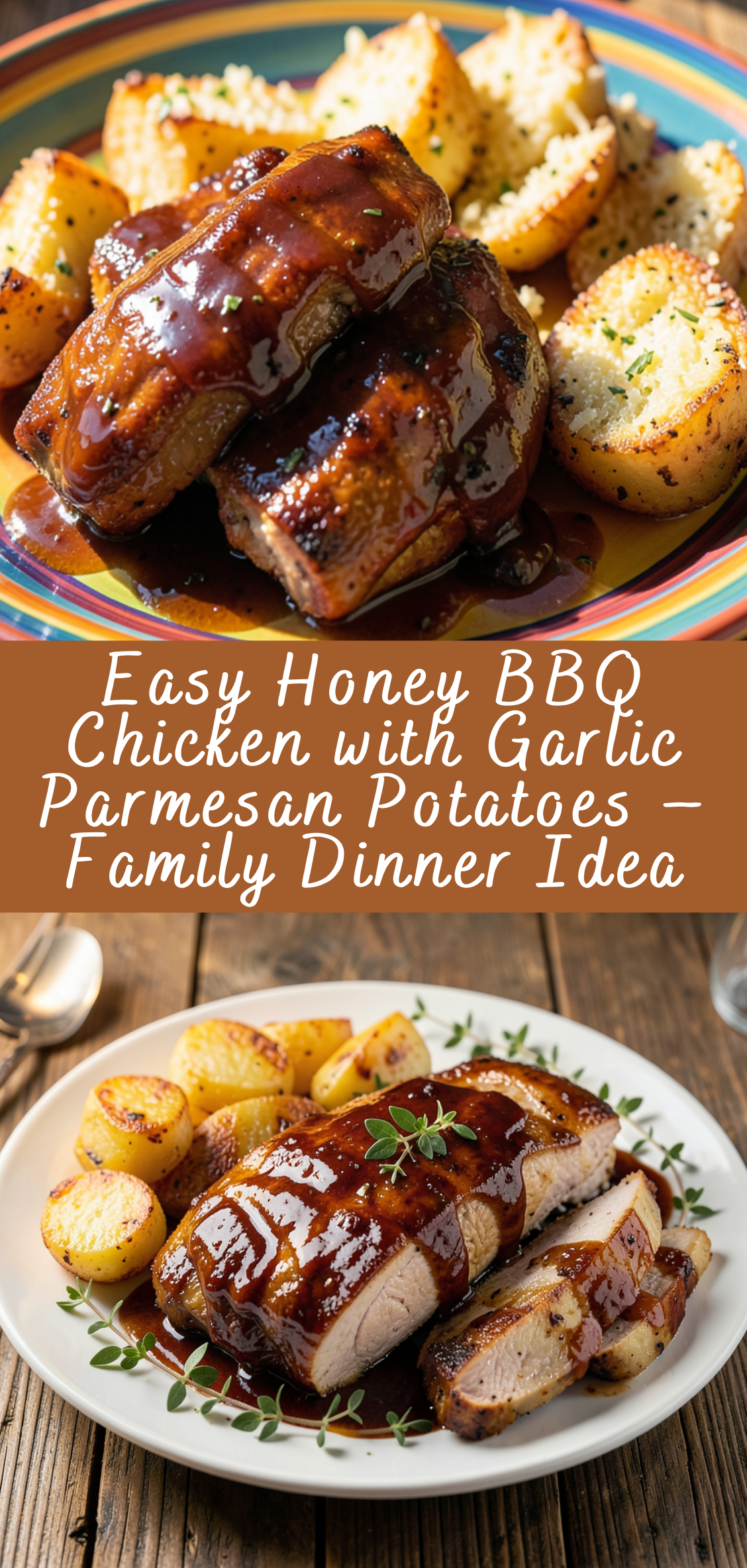 This Easy Honey BBQ Chicken with Garlic Parmesan Potatoes – Family Dinner Idea is the perfect balance of sweet, savory, and comforting. Juicy chicken is coated in a sticky honey barbecue glaze, while crispy roasted potatoes are tossed in garlic and Parmesan for a flavorful, golden finish. Preheat oven to 400°F (200°C). Line a large baking sheet with parchment paper or lightly grease a sheet pan. In a large bowl, toss halved potatoes with olive oil, garlic, Italian seasoning, salt, and pepper. Pat chicken dry. Season both sides with salt, pepper, paprika, and garlic powder. In a small bowl, mix BBQ sauce and honey until combined. Place chicken on the other side of the baking sheet. Bake for 35–40 minutes, flipping potatoes halfway through cooking. Remove from oven and immediately sprinkle Parmesan cheese over hot potatoes. Toss gently so it melts slightly. Garnish with parsley if desired. Let chicken rest for 5 minutes before slicing. Serve alongside crispy garlic Parmesan potatoes.Easy Honey BBQ Chicken with Garlic Parmesan Potatoes – Family Dinner Idea